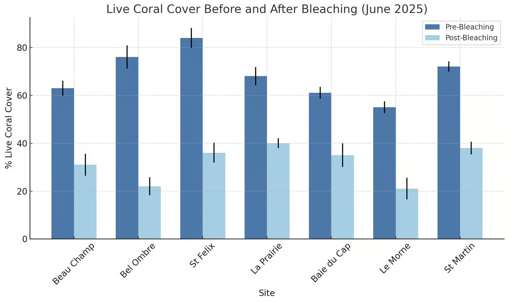 In June 2025, as sea temperatures finally began to cool (<27°C), we returned to our monitoring sites with cautious optimism, hopeful that the corals, once bleached by the unprecedented heatwave, might have begun their path to recovery. Equipped with datasheets, underwater cameras, and a quiet sense of anticipation, our team revisited key stations across Le Morne, La Prairie, Bel Ombre, Beau Champ, St Martin, and St Félix.